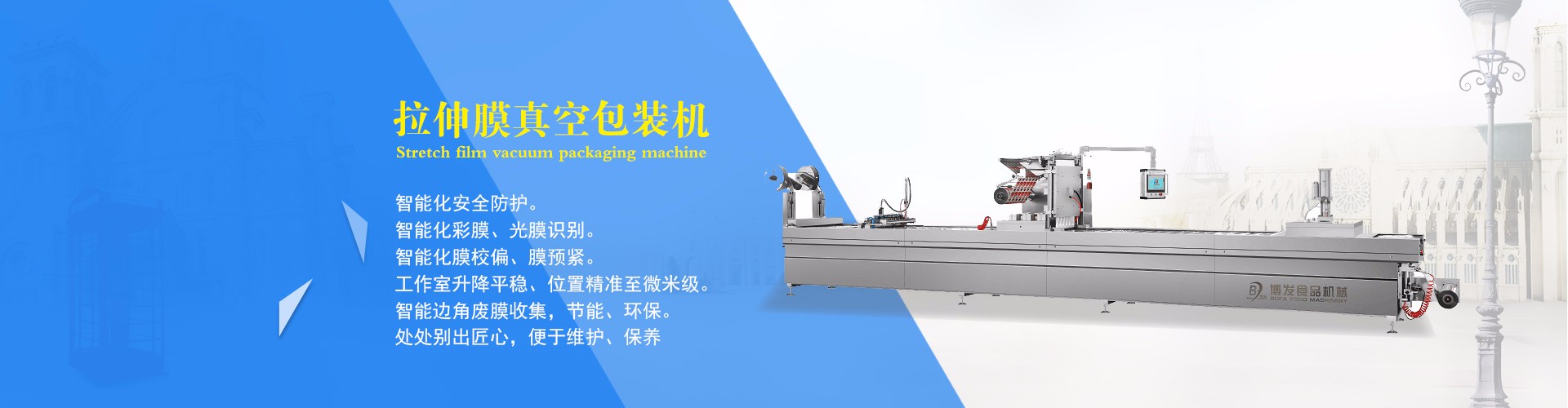 公司主要產(chǎn)品有全自動(dòng)連續(xù)拉伸真空包裝機(jī)、圓角雙面鋁膜連續(xù)拉伸真空包裝機(jī)、圓角整體切連續(xù)拉伸真空包裝機(jī)、殺菌鍋等設(shè)備,應(yīng)客戶(hù)需要,又相繼研發(fā)了:半自動(dòng)盒式氣調(diào)包裝機(jī),全自動(dòng)連續(xù)盒式氣調(diào)包裝機(jī),產(chǎn)品可廣泛應(yīng)用于各種肉制品、豆制品、奶制品、蛋制品、海產(chǎn)品、飲料制品、休閑食品等的生產(chǎn)加工,以及農(nóng)副產(chǎn)品深加工、化工醫(yī)藥的生產(chǎn)等。